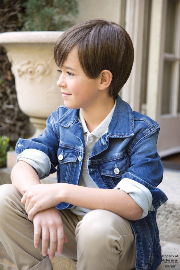 Logan is a short-length synthetic wig from the Amore Children's Wig Collection. It has straight ready-to-wear hair in a unisex style with tapered nape and natural body. The cap construction is lace front with lace part cap that makes the wig feel light weight and comfortable. Logan also includes wefting with an invisible hairline and a Monofilament Wigs top covered with soft material and elastic lace to give the cap more flexibility.
