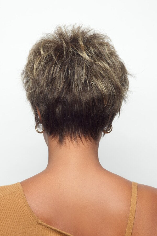 Roni is a short-length synthetic wig from the Noriko Collection. It has straight ready-to-wear hair in a multi-layered style. Roni has maximized volume texture with nape-hugging tapered edges. The cap construction is machine made with adjustable tabs in the back nape area allowing you to create a comfortable fit.